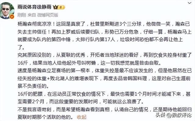 昨天,杨瀚森被下放到发展联盟的操作,徐静雨点评是“认为他在美国期间出现暴饮暴食,2-3个月吃成这样,一步步错过机会。”